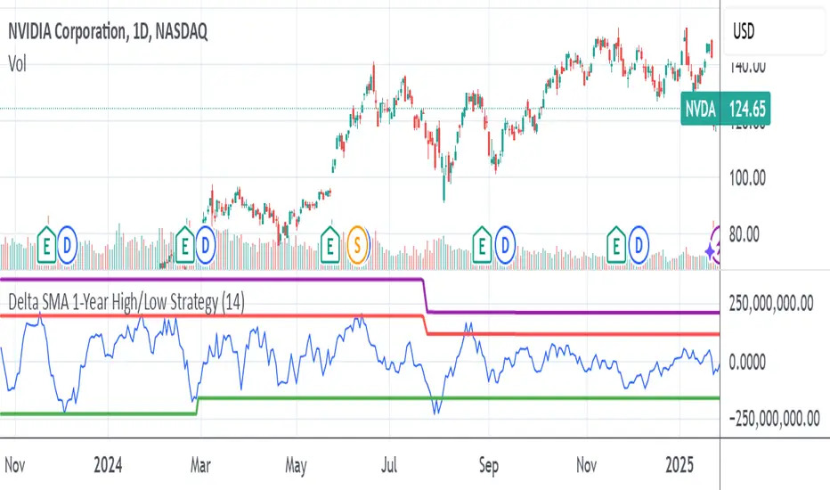 - The strategy calculates the 1-year high and low of the Delta SMA.