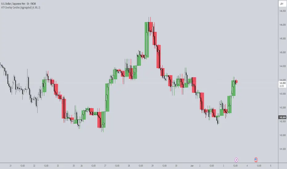 Each synthetic candle is built by combining a user-defined number of consecutive bars (e.g., 4 bars from the current timeframe form one aggregated candle). It accurately tracks open, high, low, and close values, then draws a colored box and wick to represent the aggregated data.