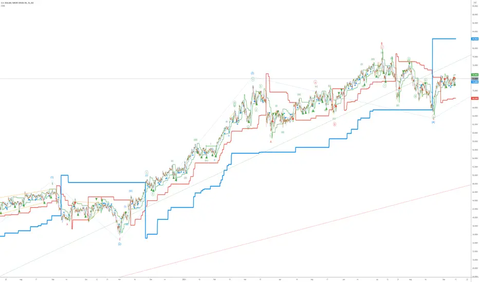 The indicator is based on a supertrend. Supertrends are built in accordance with the Fibonacci grid. The degree of waves in the indicator settings corresponds to a 1-hour timeframe - this is the main mode of working with the indicator. I also recommend using weekly (for evaluating large movements) and 1-minute timeframes.