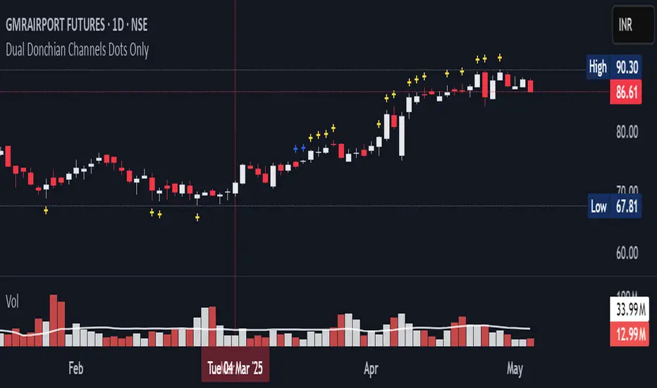 1. **Indicator Declaration**: The script is named "Dual Donchian Channels Dots Only" and overlays on the price chart.