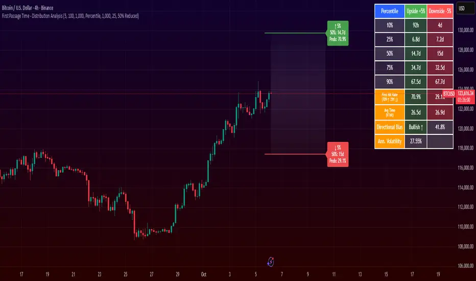 The First Passage Time (FPT) Distribution Analysis indicator is a sophisticated probabilistic tool that answers one of the most critical questions in trading: "How long will it take for price to reach my target, and what are the odds of getting there first?"