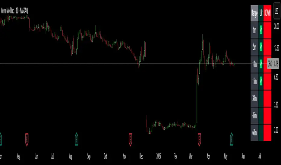 This indicator monitors whether price breaks above or below the Opening Range across multiple key durations — 1m, 5m, 10m, 15m, 30m, 45m, and 60m — using 1-minute data under the hood, while you can work on higher timeframe charts (daily, etc.).