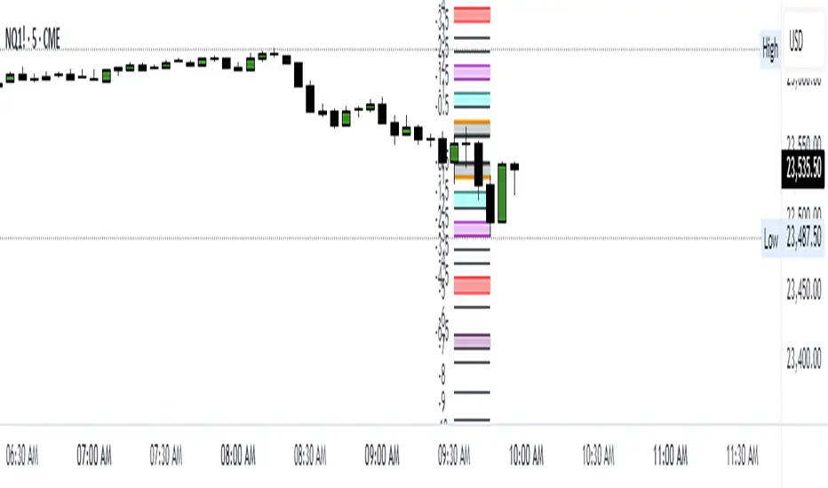 This script gets the opening range for NQ,ES, and YM. It then created deviations based on this range as targets to take profit from. You may also use the deviations to enter into trades looking for the other side of the range. You have the ability to shade areas of the range.