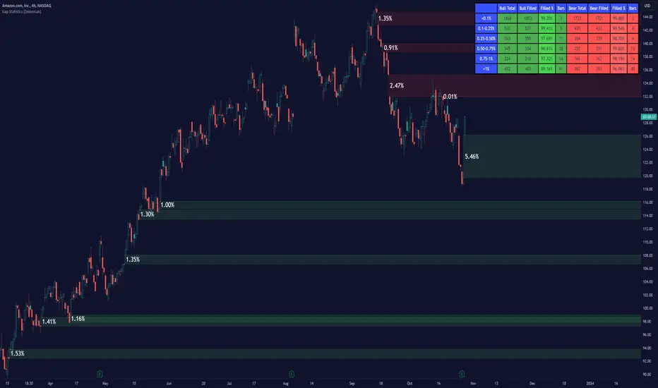 The Gap Statistics (Zeiierman) indicator is crafted to monitor, analyze, and visually present price gaps on a trading chart. Price gaps are areas on a chart where the price jumps up or down from the previous close to the next open, creating a "gap" in the normal price pattern. This script delivers an extensive range of statistics related to these gaps, encompassing their size, direction (whether bullish or bearish), frequency of getting filled, as well as the average number of bars it takes for a gap to be filled. The indicator also visually represents the gaps, making it easier for traders to spot and analyze them.