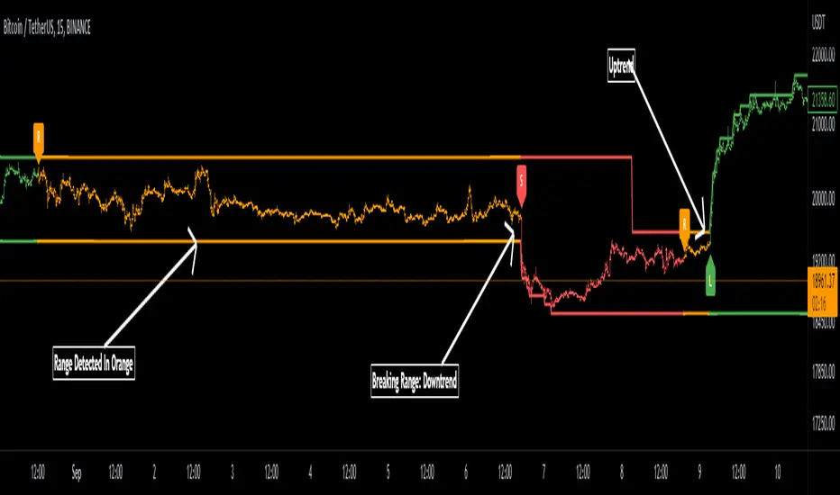Depending on this, the indicator interprets a ranging market, an uptrend or a downtrend.