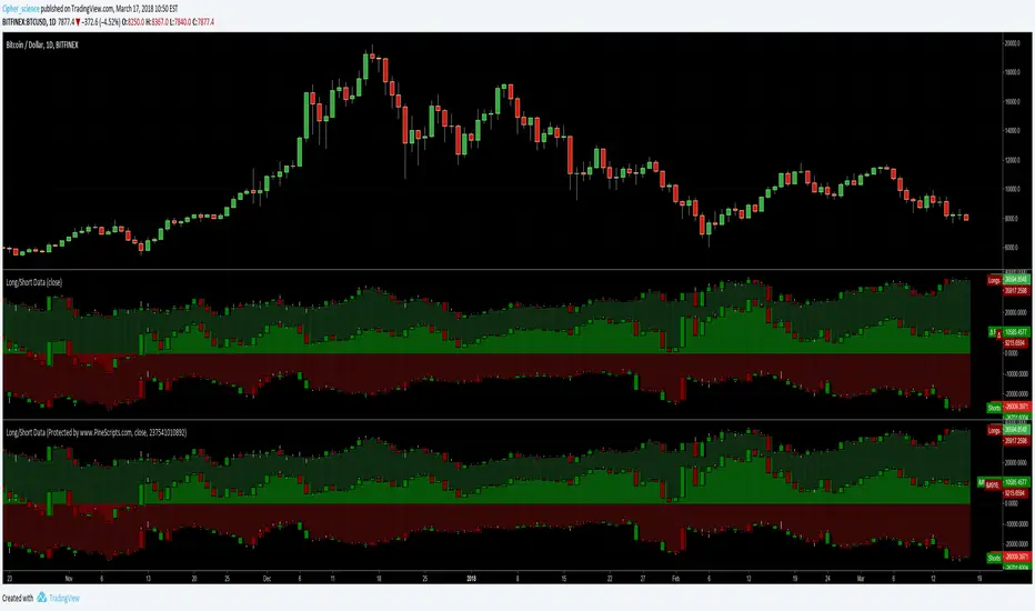 Indicator displaying long/short data for BTCUSD on Bitfinex. The delta(Δ) is shown on the interior and the net is shown on the exterior. The candles and used to display the changes in the data. Total shorts are represented as a negative number even though they are a positive value.