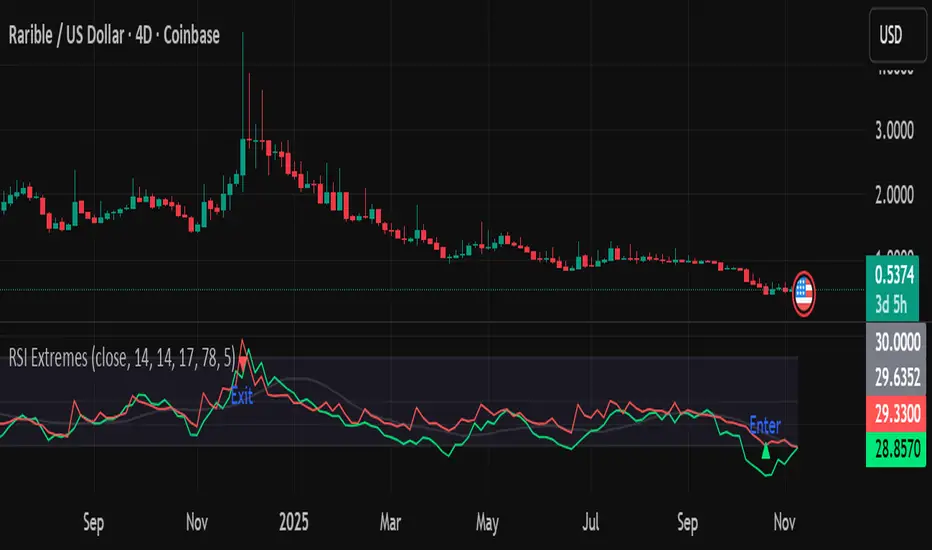 Tags: indicator, rsi, momentum, extremes, enter-exit, levelenter, levelexit, realtime, educational, research, visualization, pine-v5