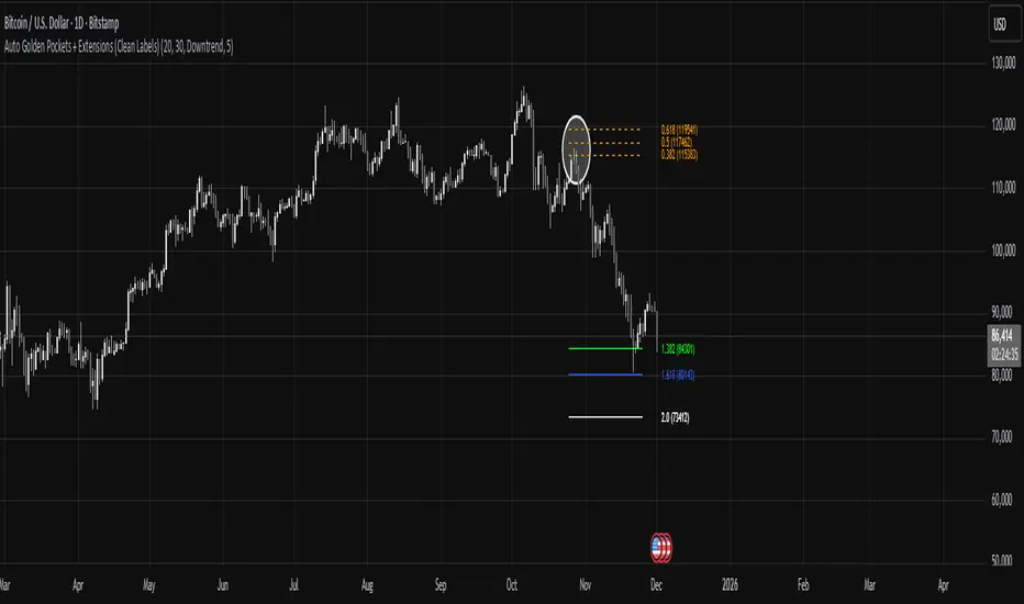 This indicator automatically detects the latest confirmed swing high and swing low, determines the current trend direction, and plots the most important Fibonacci retracement and extension levels. Once a new swing forms, the script instantly redraws clean 0.382, 0.500, and 0.618 “Golden Pocket” retracements, along with 1.382, 1.618, and 2.0 extensions. Negative-side Fibonacci projections are also included for deeper pullbacks or overextensions.