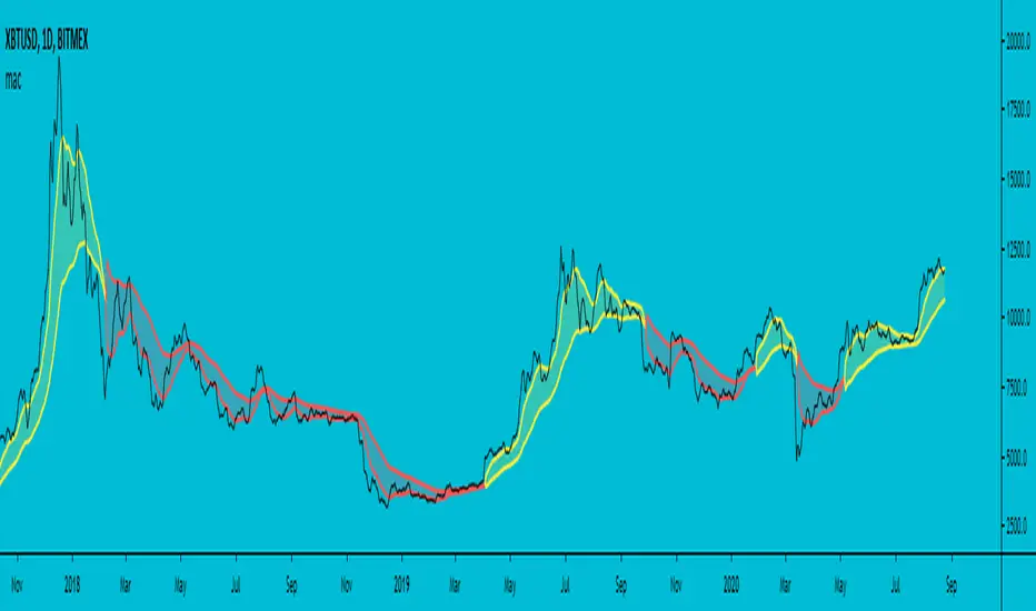 MA Cross normally uses close as source in the moving averages, this script uses highs and lows as source.