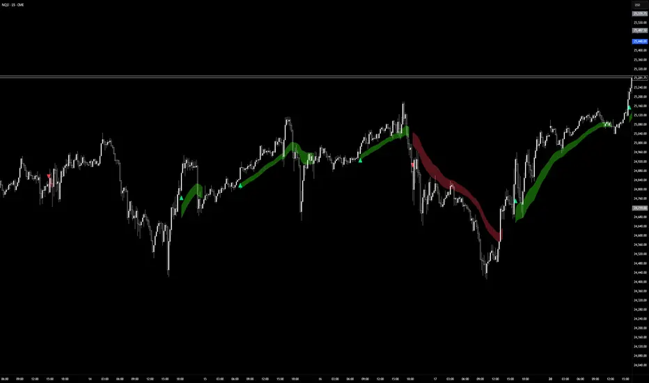 This system blends volume flow, higher-timeframe directional context, and momentum behavior to detect genuine trend transitions while filtering out chop and noise. Trend phases are visualized through an adaptive channel, and trade signals only trigger when structure, bias, and momentum align.