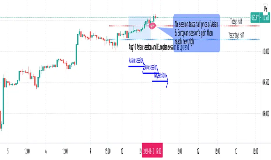 In this case, Asian & European session is an uptrend. When the NY session starts, it tests the half of Asian & Euro sessions’ gain then records new high.