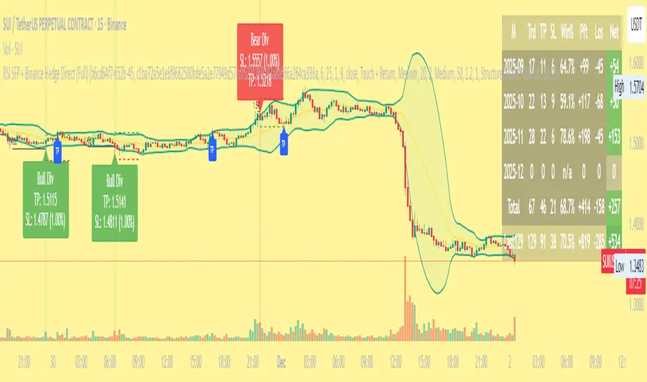 Introduction This is a specialized RSI SFP (Swing Failure Pattern) strategy script tailored for the Binance Futures Signal Bot. It eliminates the need for third-party middleware (like WunderTrading), enabling direct, low-latency execution from TradingView to Binance with minimal slippage.