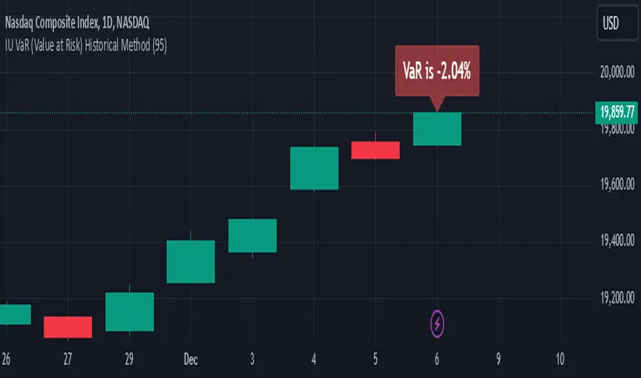 This Pine Script indicator calculates the **Value at Risk (VaR)** using the **Historical Method** to help traders understand potential losses during a given period( Chart Timeframe) with a specific level of confidence.