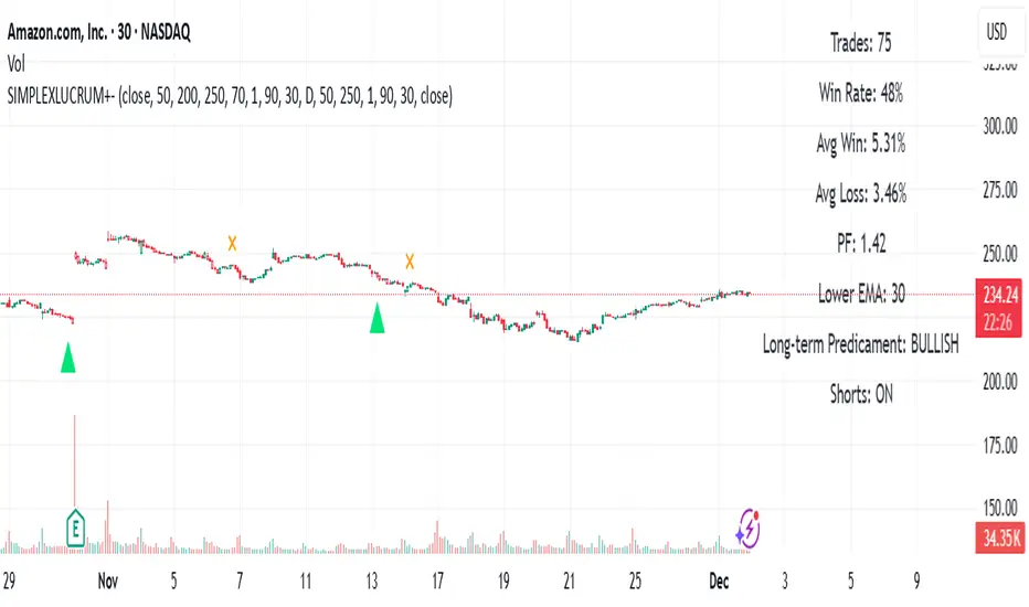 Suitable for equities market(stocks), this version works in an uncertain or bearish market, it looks for both shorts and longs, and its counterpart is the SIMPLEXLUCRUM indicator. Best suited for the 30 min TF or above.