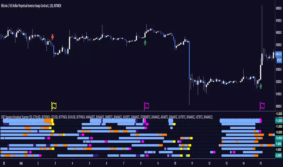 The DBT Squeeze Scanner helps you keep an eye on 10 instruments at the same time. It uses a modified version of the DBT Squeeze strategy and scans this strategy against 10 instruments at the same time.