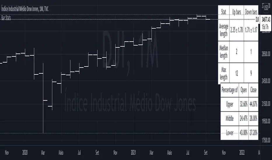 For the bar length statistics, it takes every length of upper or lower movements and calculates their average (with SD), median, and max. That way, you can see whether there is a bias in the market or not.