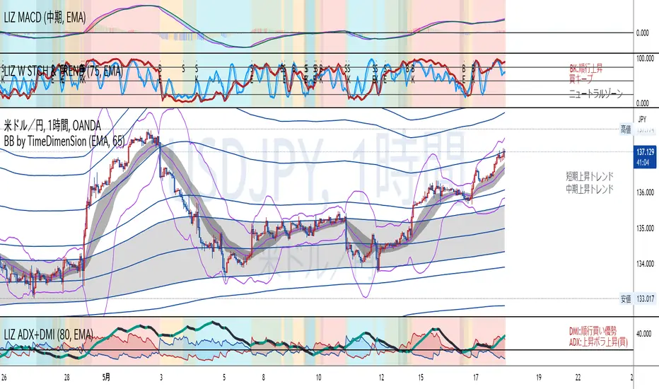 各時間足には、最適な中心バンドを持つ短期、中期のボリンジャーバンドが自動表示されます。