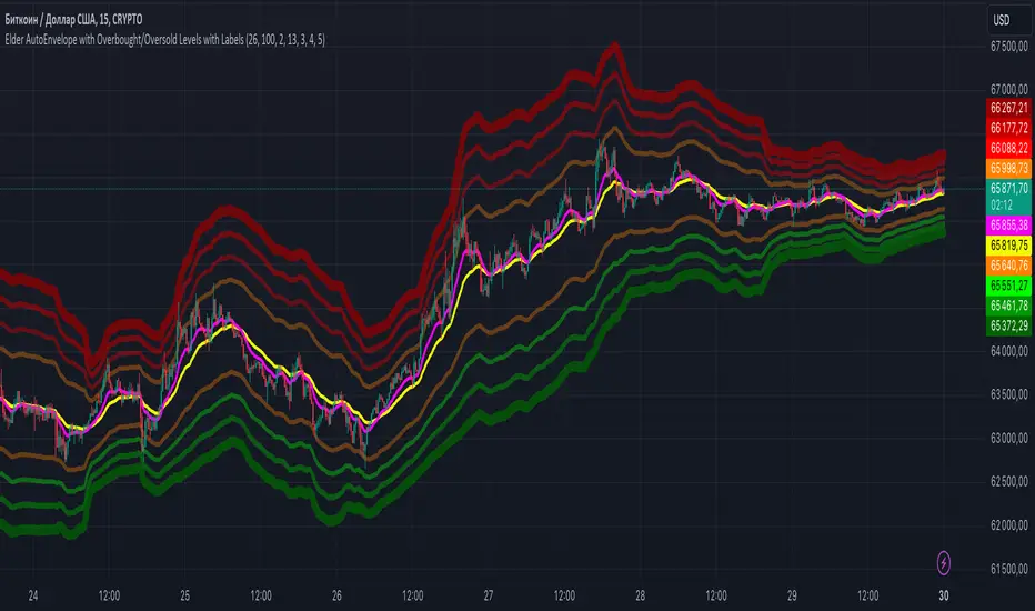 The **"Elder AutoEnvelope with Overbought/Oversold Levels with Labels"** is a technical analysis tool designed to help identify overbought and oversold levels in the market, as well as potential reversal points. It uses moving averages and price volatility to detect possible price extremes.