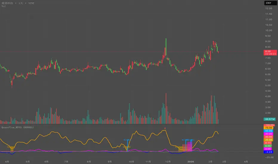 QuantFlow_MSVO 是一款专业量化指标,用于追踪机构资金流向、基准指数情绪及趋势衰竭。通过对比标的与参考指数(如上证指数)的资本动态,识别资金共振区——个股与大盘同步吸筹或派发的关键区域。