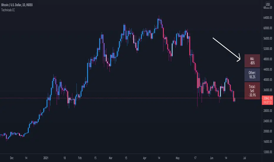 For those that want technical ratings but don't want waste valuable screen real estate. Candles are colored to the rating strength. It also plots the results for "total", "MA" and "other" in a table on right of screen. Table and candle coloring can be turned off in style settings. This script uses the built in Technical Ratings indicator. For more informations on Technical Ratings please refer to official documentation.