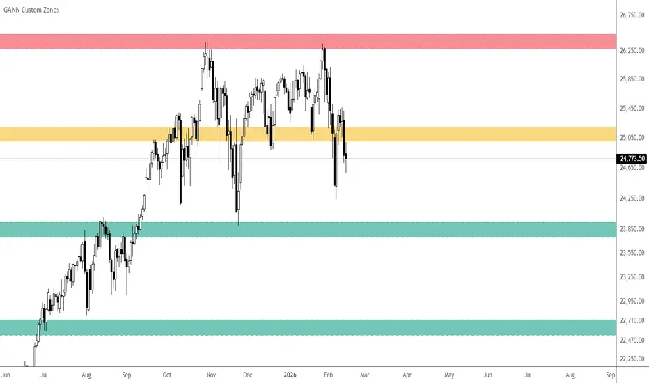 GANN Custom Zones is a manual price-projection tool inspired by the Square of 9 methodology. The script allows traders to define two custom anchor prices and automatically generates projected support and resistance zones based on configurable increments.