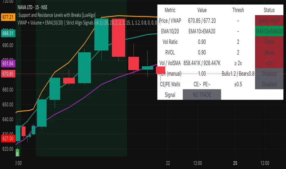 • Strict Align Mode → A Long signal triggers only when ALL conditions agree (VWAP, EMA crossover, strong volume).