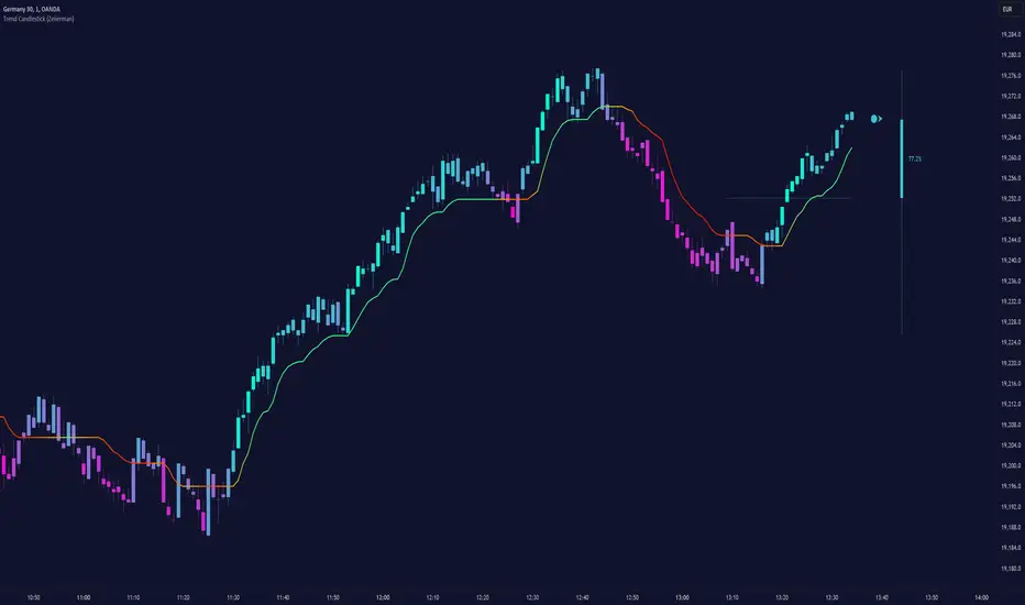 Trend Candlestick (Expo) identifies the direction of the trend and Zones are displayed where the trend changes. The user has the ability to adjust the settings so that long term, as well as short term trend direction and trend changes, can be visualized.