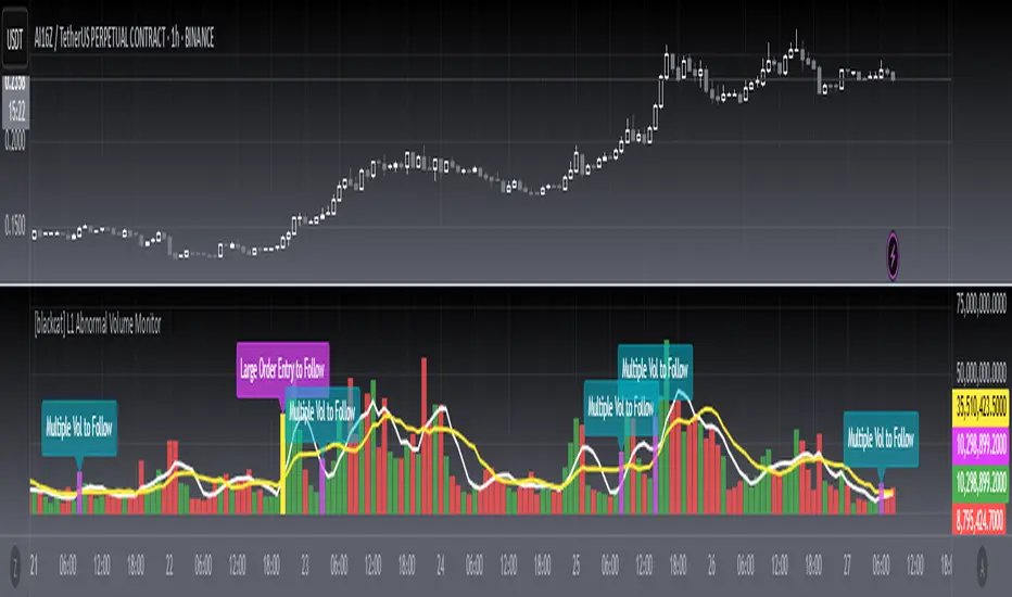 OVERVIEWL1 Abnormal Volume Monitor is a comprehensive volume analysis indicator designed to detect unusual trading patterns and potential large order entries. The script utilizes multiple technical indicators and volume-based analysis to identify significant market movements, particularly focusing on triple volume conditions and large order entries that may precede price movements.