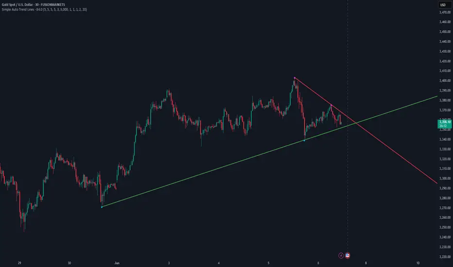 Simple Auto Trend Lines automatically identifies and draws key trendlines on your chart by detecting significant pivot points in price action. Unlike manual trendline drawing that relies on subjective judgment, this indicator uses algorithmic pivot detection to create objective resistance and support trendlines.The indicator works by identifying pivot highs and lows using customizable lookback parameters, then connecting these pivots to form valid trendlines. A trendline is considered valid when no price action penetrates it between the connected pivot points. The script intelligently filters out invalid lines and prioritizes the most significant trendlines based on your settings.