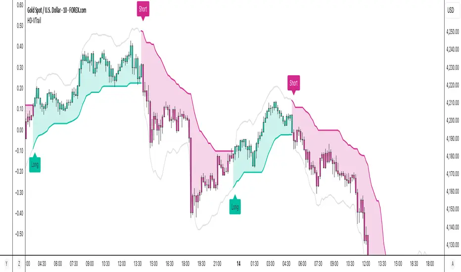 - The indicator builds an adaptive trail around a smoothed price basis: