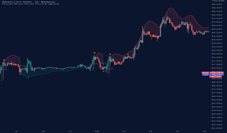Market Waves is a comprehensive technical analysis tool designed to identify market trends with minimal lag while filtering out noise. By combining a modified Hull Moving Average (HMA) with Volatility Bands (ATR), this indicator provides a clear visual representation of market direction, entry signals, and automated Take Profit targets.