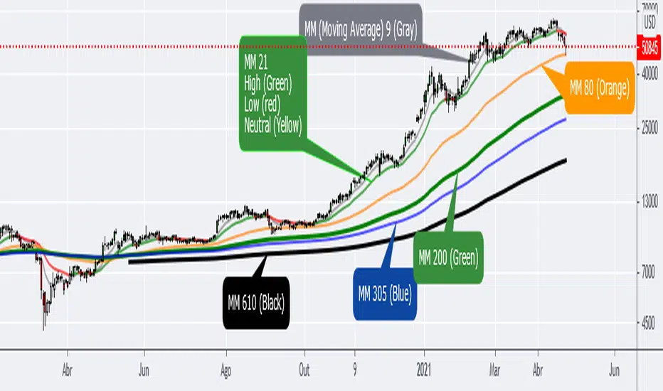 This indicator contains the main exponential moving averages (9, 21, 80, 200, 305 and 610), which I use in my operational.