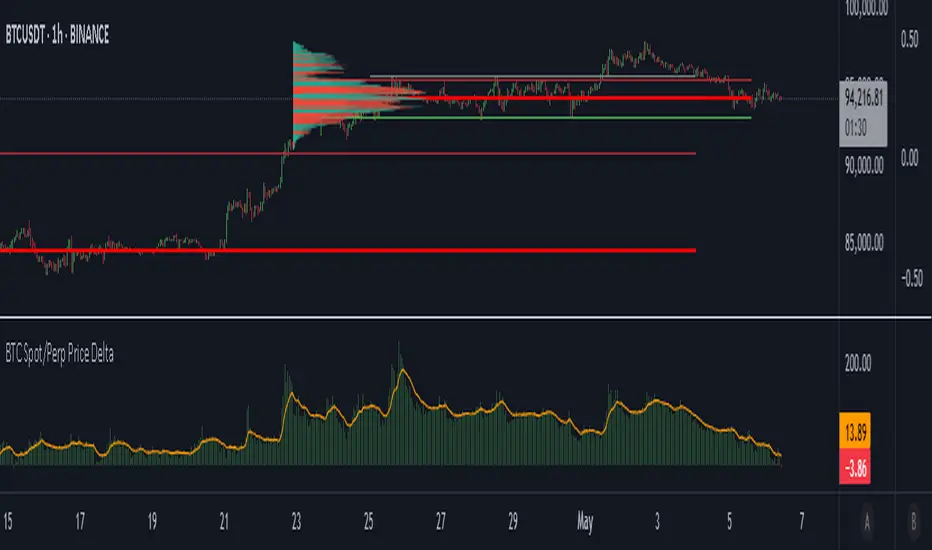 The indicator gathers price from 3 btc spot pairs (largest by volume) and 3 btc perp pairs (also largest by volume).
