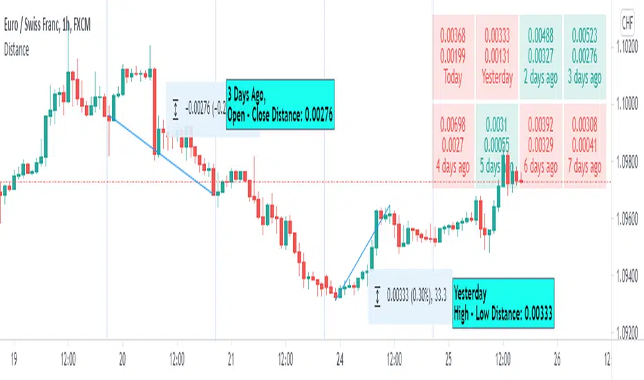 Pinescript tables are a nice addition to the language. This one shows a complete distance from daily low to daily high and/or from the daily open to the daily close.