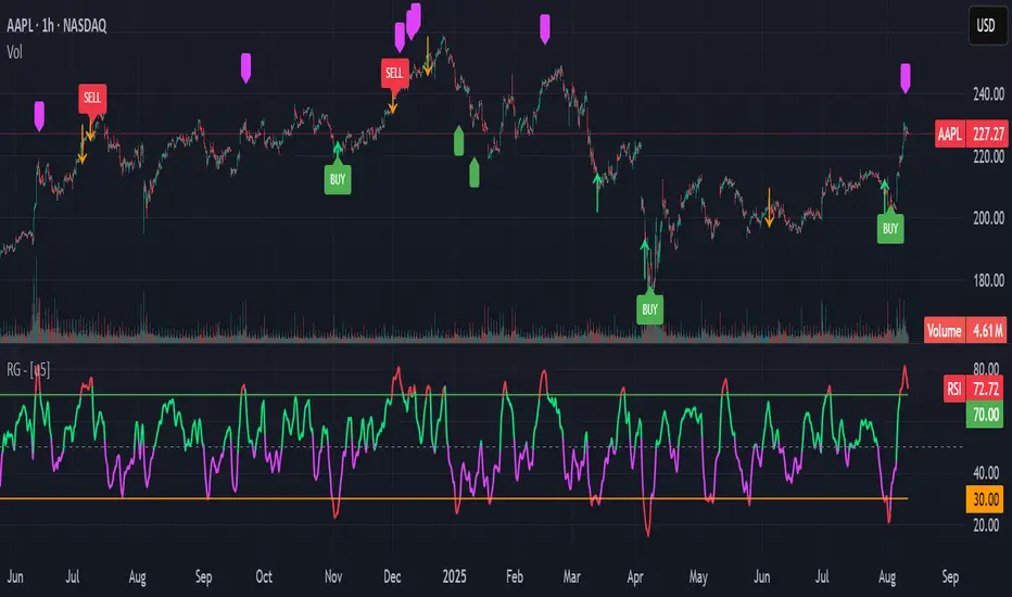 I have an optional built-in toggle to show green or red dots on the RSI line using two separate RSI lengths that are amplified and plot based on RSI divergence and strength. This can be used as a visual confirmation (or rejection) against the chart overlay plots.