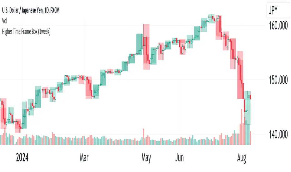 The Higher Time Frame (HTF) will be displayed in a box. You can choose HTF periods from: 15min, 30min, 1hour, 2hour, 3hour, 4hour, 6hour, 8hour, 12hour, 1day, 1week, 2week, 4week, 1month, 2month, 3month, 4month, 6month, and 1year.An error will occur if you set a period longer than the current candlestick period being displayed. The HTF Box can display a maximum of 500 boxes. There is no guarantee that all combinations of periods will work correctly.