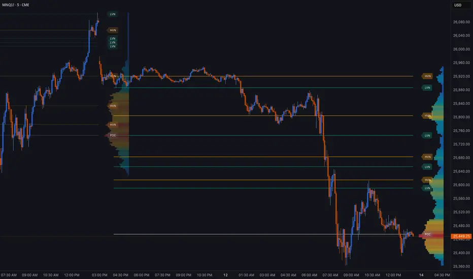 This tool builds a true volume distribution for each trading session using lower-timeframe data, detects high- and low-volume nodes, and tracks a dynamic Point of Control (POC) to help traders identify balance, acceptance, and trend conditions in real time.