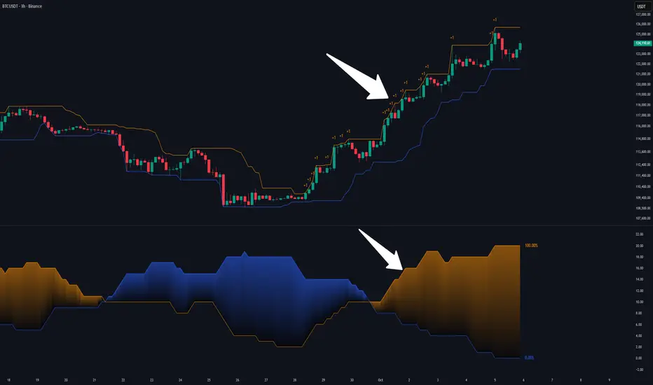 Pine Script® for i = 0 to period-1 h = high l = low if h == upper countUp.push(1) if l == lower countDn.push(1) - The balance between bullish and bearish counts highlights dominance and imbalance.