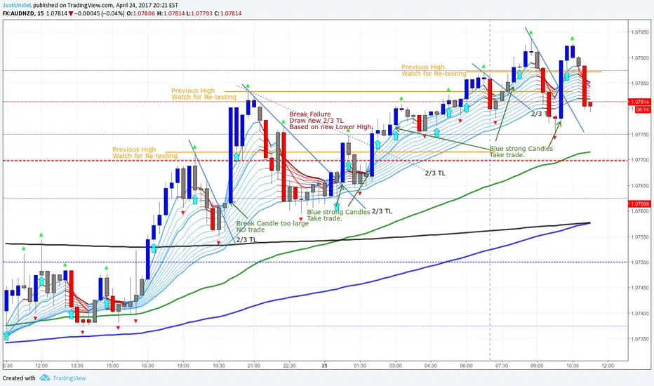 - Once the trend direction and any potential major reversals highlighted, drop down to lower timeframe chart and draw appropriate mini Trend line (2/3 TL) matching the established momentum direction. Take note of potential pull backs from and of the EMAs, in particular the EMA5-12 ribbon, EMA12-36 Ribbon and the 200EMA. Can use the Pivots and/or Fractals points to guide your 2/3 TL drawing.