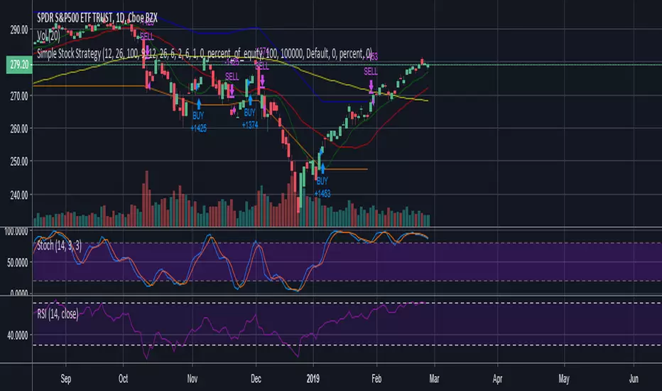 This is a simple and easy to use strategy for low-volatility stocks. It prints a BUY or SELL signal to alert you that certain conditions have been met. I use it as a time saver to help identify which charts I need to look at. You can adjust the inputs and properties to suit your needs. I would suggest allowing two or three orders.