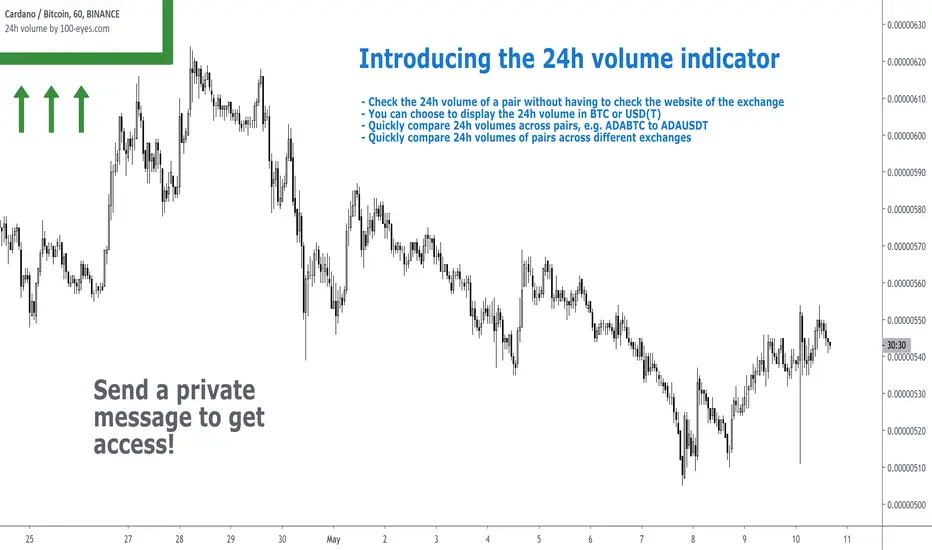 100eyes asked me to create a new Tradingview indicator that estimates the 24h volume of a pair. Works for all BTC/USDT/USD/ETH crypto pairs. You can choose to display the 24h volume in BTC or USD(T).