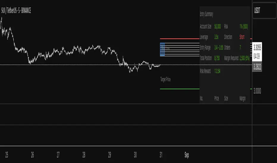 Progressive Entry Position Sizer (PEPS) - DEVELOPMENT VERSION⚠️ IMPORTANT DISCLAIMER: This indicator is currently in development and should NOT be relied upon for trading accuracy. Use at your own risk and always verify calculations independently before making any trading decisions. I have not fully tested the calculations or R:R accuracy yet and there may be inaccuracies.