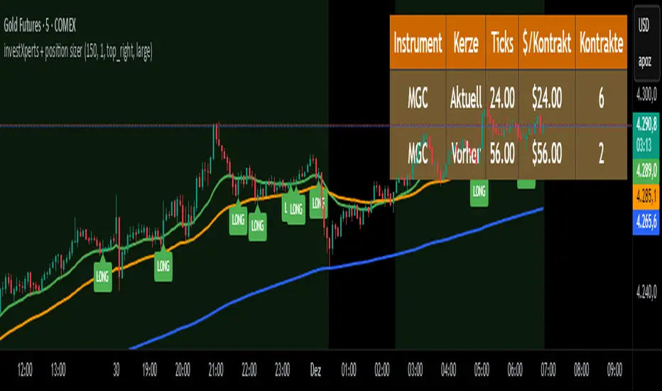 Complementing the entry logic, the built-in position sizer calculates the exact position size for MGC in real time, based on the actual candle range. It determines the number of ticks, the dollar risk per contract, and the precise number of contracts that can be traded, with an optional calculation of the previous candle as well. This removes the need for manual calculations and ensures that position sizing adjusts dynamically to market volatility.
