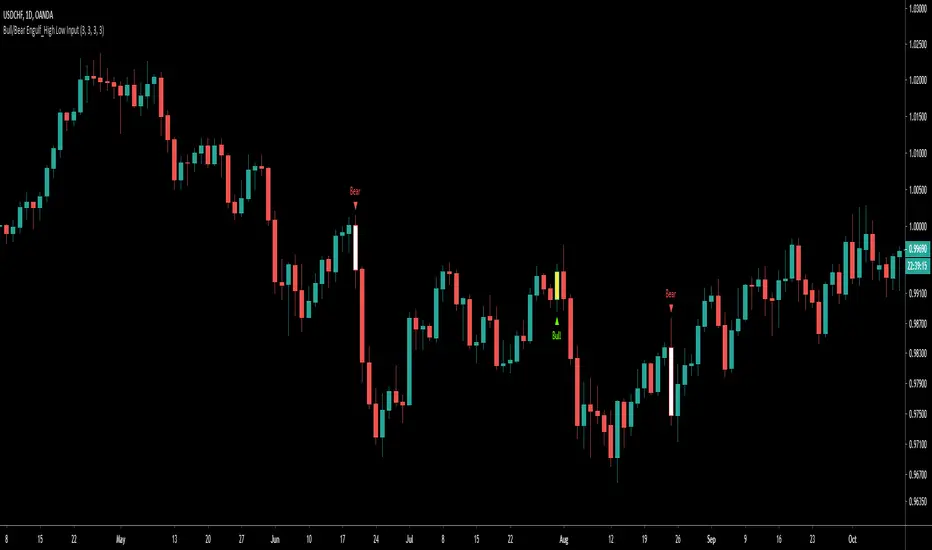 Allows to specify the high and low look-back period for both Bullish and Bearish engulfing candles. In essence, it is an extension of the classical engulf pattern. By default lookback period is set to 3.
