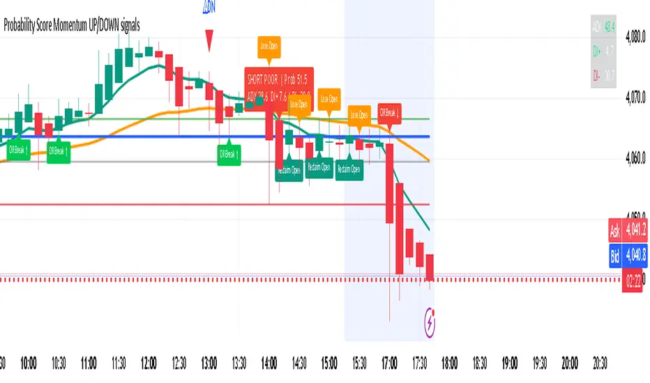 Probability Score Momentum is an advanced multi-factor trading indicator that combines institutional-grade filters with probability scoring to identify high-conviction trade opportunities. This indicator goes beyond simple moving average crossovers by validating signals through multiple momentum confirmations, trend alignment, and context-aware market structure analysis.