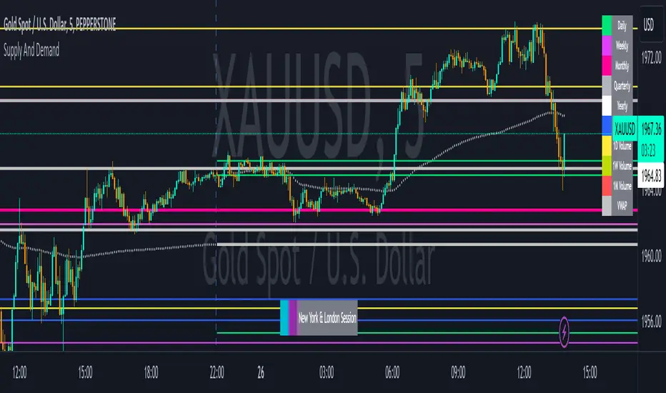 This supply and demand indicator uses sessions, volume spikes, higher timeframe price action and other volume calculations to spot areas on the chart where price will likely react. From the 1 minute and below charts to the daily and up charts, you can get excellent levels for any timeframe.