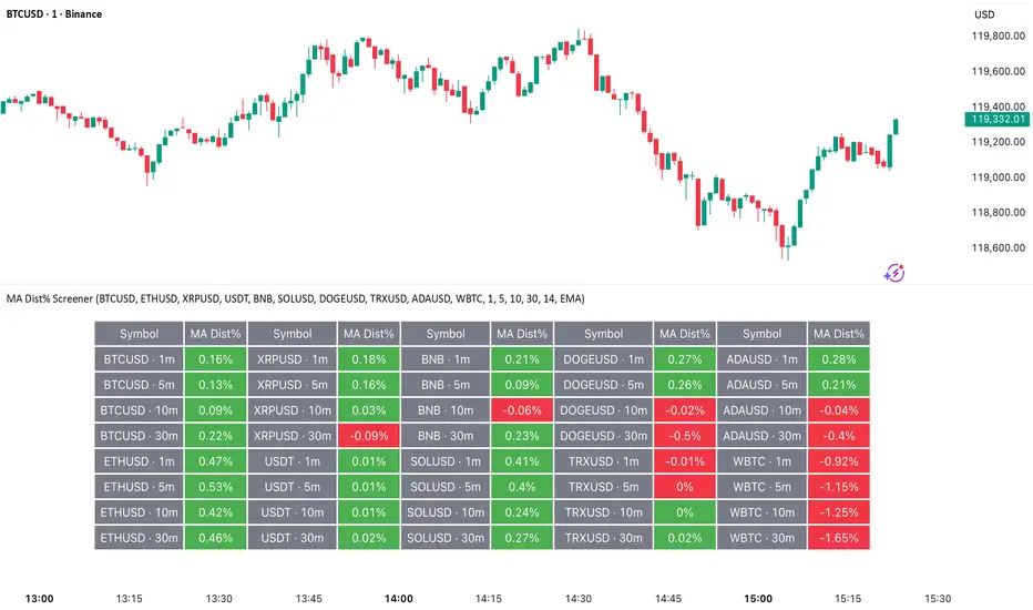 - Visualize real-time % distance between price and moving average per asset/timeframe in a clean, color-coded table.