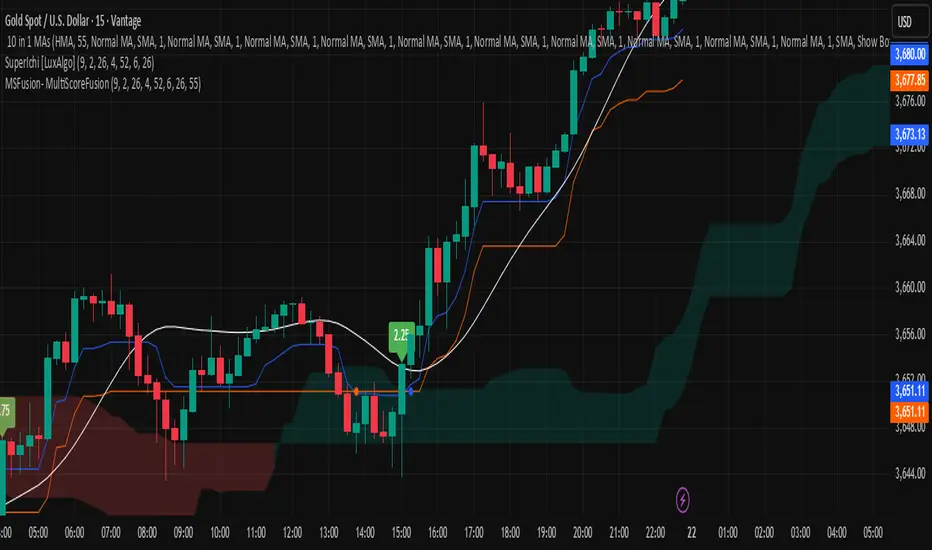 This Pine Script strategy, MSFusion - MultiScoreFusion, combines Ichimoku components and Hull Moving Average (HMA) signals to generate a composite score for each bar.