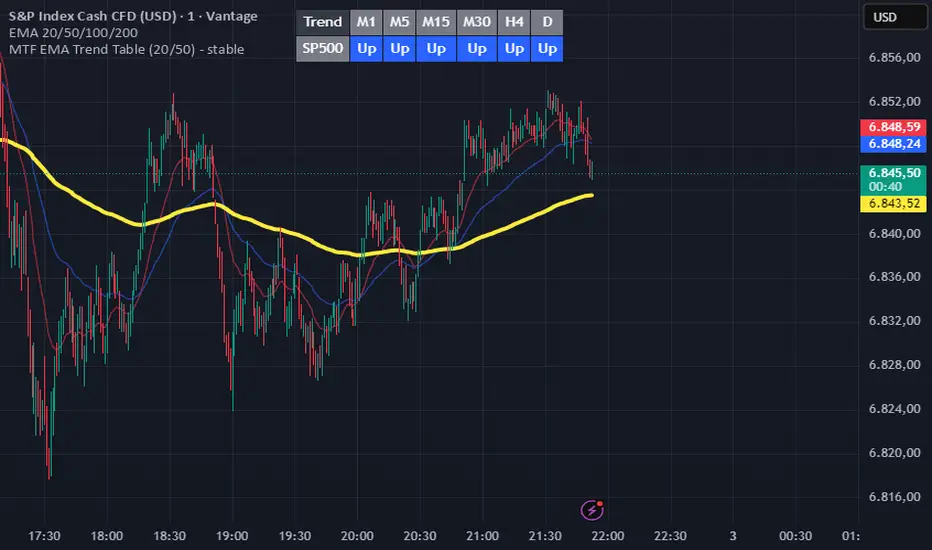 If the EMA 20 is above the EMA 50, the table displays Up and Blue in the respective time frame, and if the EMA 20 is below the EMA 50, it displays Red and Down.