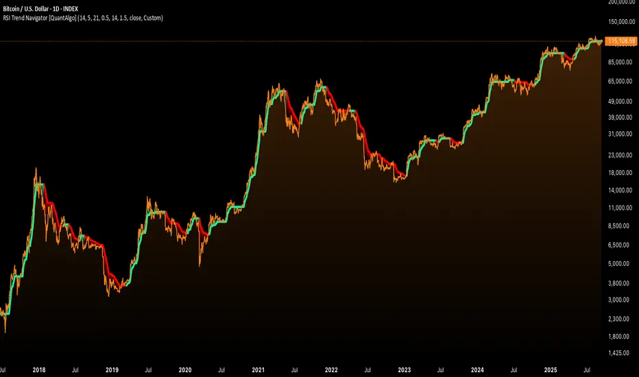 The RSI Trend Navigator integrates RSI momentum calculations with adaptive exponential moving averages and ATR-based volatility bands to generate trend-following signals. The indicator applies variable smoothing coefficients based on RSI readings and incorporates normalized momentum adjustments to position a trend line that responds to both price action and underlying momentum conditions.